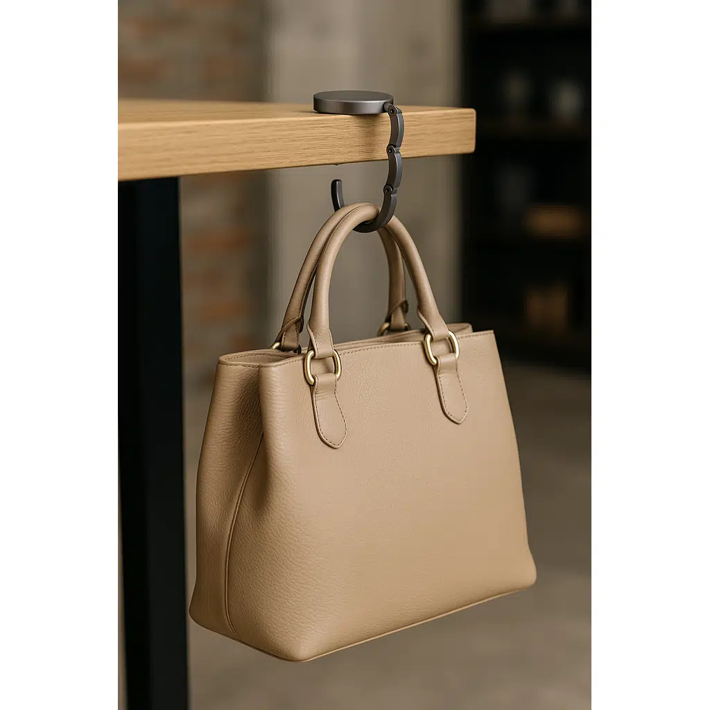Metal çanta askısı, masanın kenarına montaj gerektirmeden takılarak çantanızı temiz, güvenli ve erişilebilir bir şekilde asmanızı sağlar. Kompakt, katlanabilir yapısı sayesinde çantanızda veya cebinizde rahatça taşıyabilirsiniz.